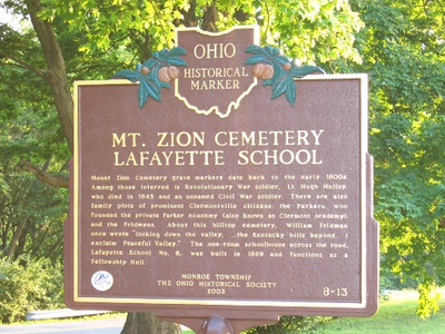 Mt. Zion Christian Church Cemetery was honored by the Ohio Historical Society in 2003 for the many veterans and prominent grave markers that date back to the early 1800s. The marker states the following: